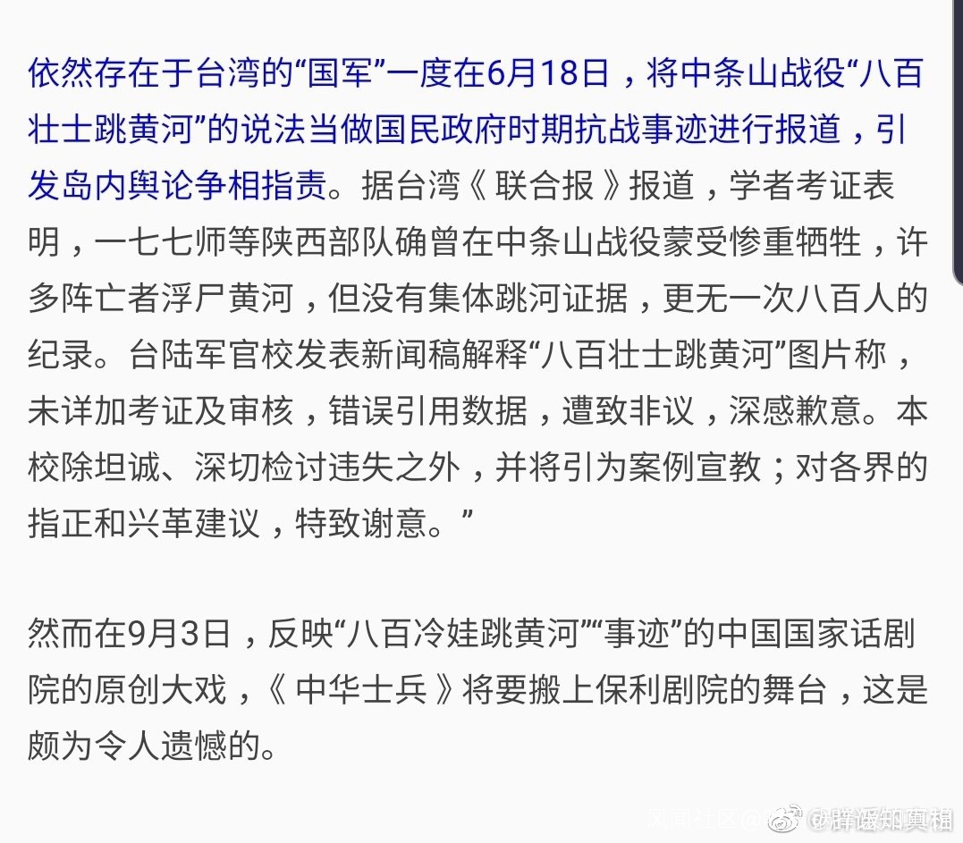 但不管怎麼説,四行倉庫這一戰是真實發生過的,如果《八佰》有一些藝術誇張也可理解。總比@中國國家話劇院 以國軍“八百壯士集體跳黃河”這一虛構的、連國軍自己都不承認的“事蹟”(見圖二),來打造原創大戲”紀念抗戰勝利70週年”要靠譜一些
