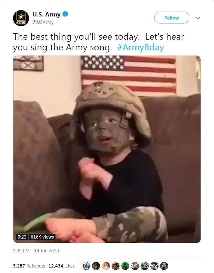 “美國陸軍(@U.S.Army)”14日官方推特發佈的視頻顯示:一個小男孩臉塗迷彩,頭戴軍盔,唱着美國陸軍軍歌《陸軍勇往直前》(《the Army Goes Rolling Along》),並雙手緊握隨身體擺動。視頻配有文字稱:(這將是)你今天所見之最好的東西。讓我們聽聽你唱軍歌。