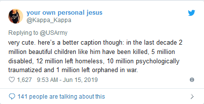 有網友表示,“是很可愛。(但)這裏有一個更好的説明:在過去十年中,有200萬像他一樣漂亮的孩子被殺害,500萬淪為殘疾人,1200萬無家可歸,1000萬受心理創傷,100萬淪為孤兒。”↓