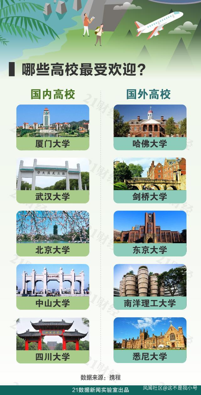從國內高校看,最受歡迎的是廈門大學,畢竟在各種全國最美大學排行榜經常榜上有名。雖然過了櫻花季,武漢大學亦頗受考生嚮往。在海外高校方面,佔據人氣榜首位的是哈佛大學。