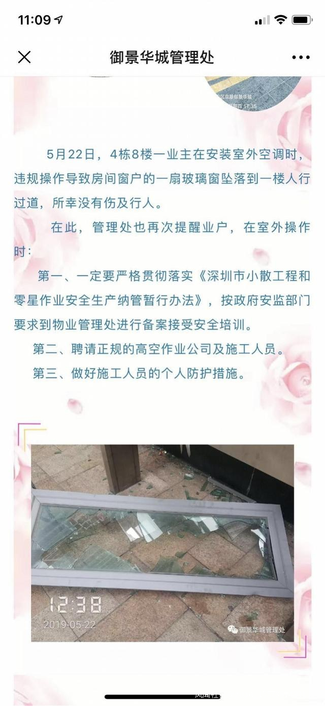 京基御景華城住宅樓據業主反映是2005年交樓,至今已有15年樓齡。南都記者翻閲御景華城管理處微信公眾號,看到管理處也曾發佈5月22日玻璃窗墜落的信息,4棟8樓一扇玻璃窗墜落到一樓人行道。