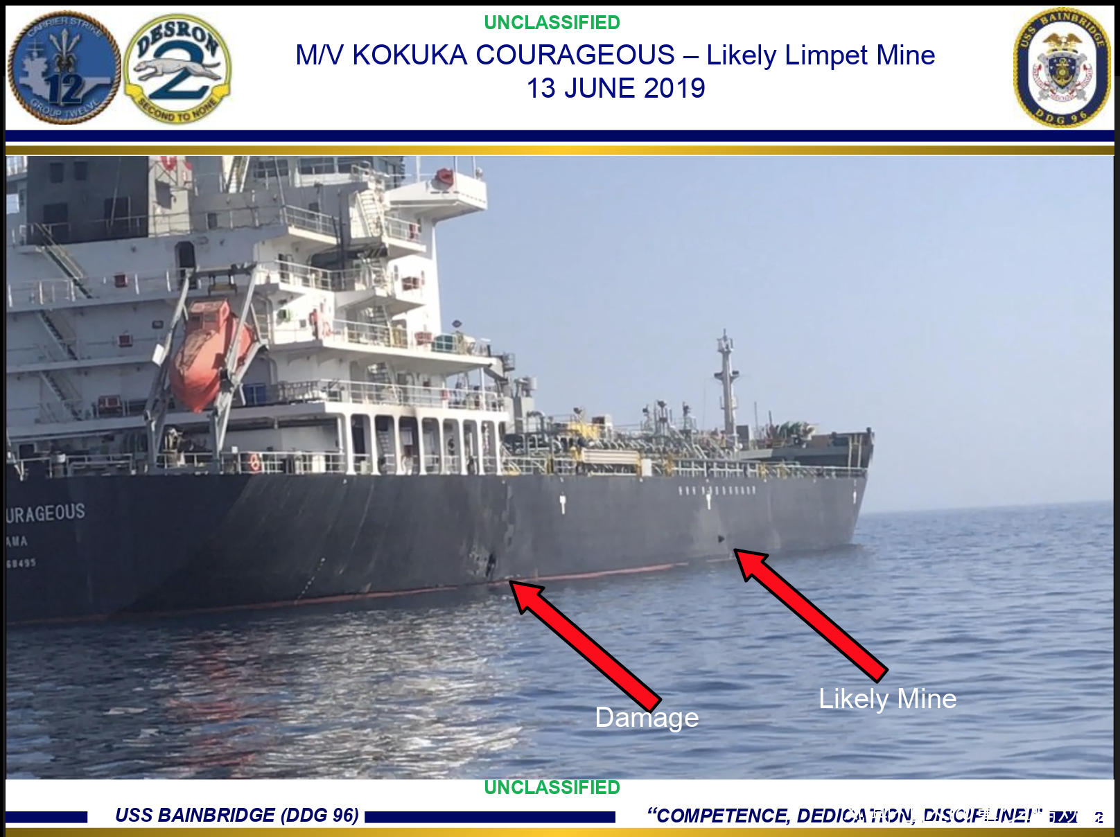 船東的説法:6月14日,日本國華產業負責人堅田豐表示,船員説油輪是遭受上方飛來物體所攻擊,且有船員目擊到飛來物體造成船體破洞;而油輪被攻擊的地方離水面有一段距離,他認為水雷、魚雷等造成的機率是零。