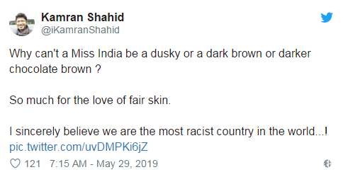 @iKamranShahid:為什麼印度小姐的皮膚不能是暗褐色、深褐色或者深巧克力色?主辦方也太喜歡白皮膚了吧!我毫不懷疑印度是世界上種族主義最嚴重的國家!