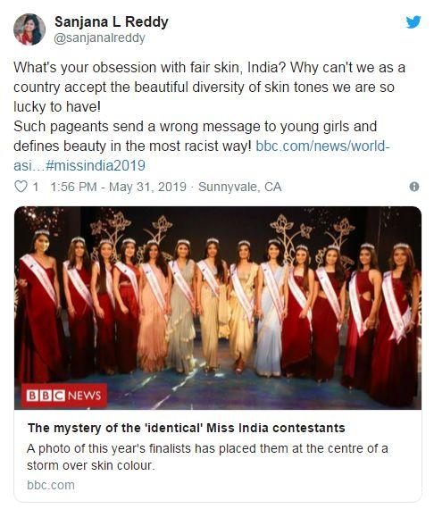 @sanjanalreddy:印度啊印度,你在對白皮膚痴迷什麼呢?作為一個國家的公民,我們多麼幸運能擁有如此美麗多樣的膚色——為什麼接受不了這一點呢?這樣的選美比賽向年輕女孩傳遞了錯誤的信息:用最種族主義的方式定義了美麗!
