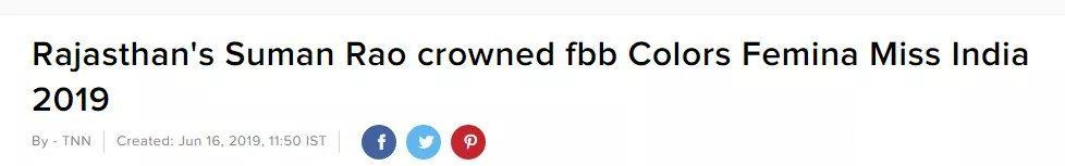 ▲Rajasthan’s Suman Rao crowned fbb Colors Femina Miss India 2019 (via Times of India)