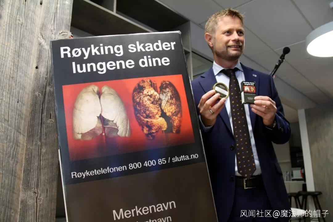 挪威衞生和社會關懷大臣霍耶向媒體展示挪威版本的煙草製品平裝設計