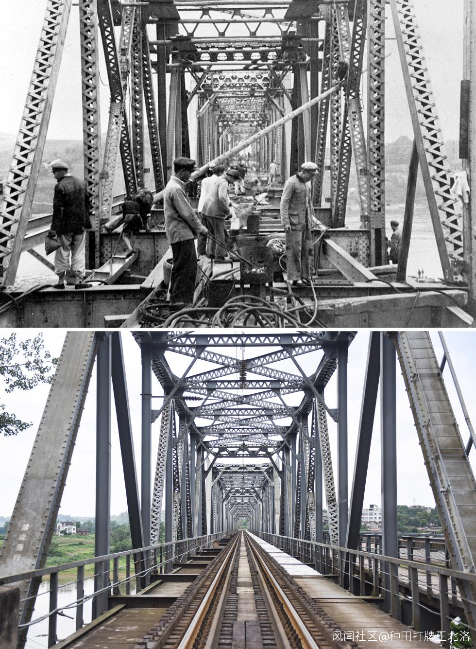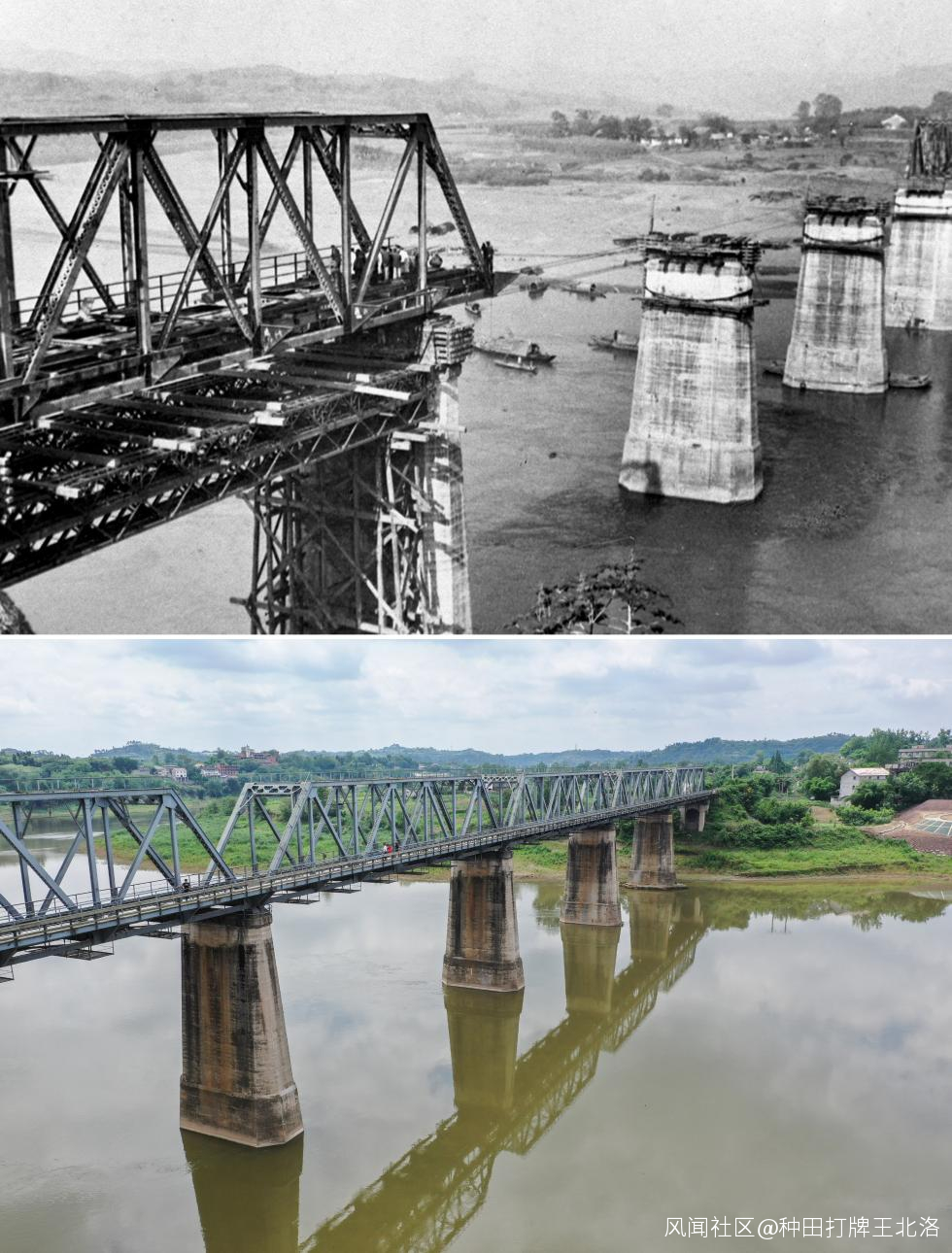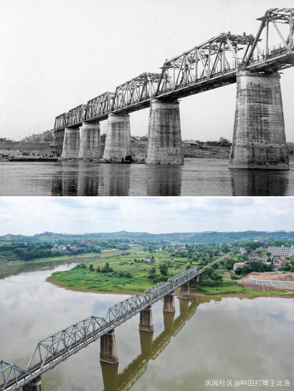拼版照片:上圖為1951年11月底完工的成渝鐵路沱江大橋(資料照片);下圖為6月12日無人機拍攝的至今仍在使用的成渝鐵路沱江大橋(新華社記者薛玉斌攝)。