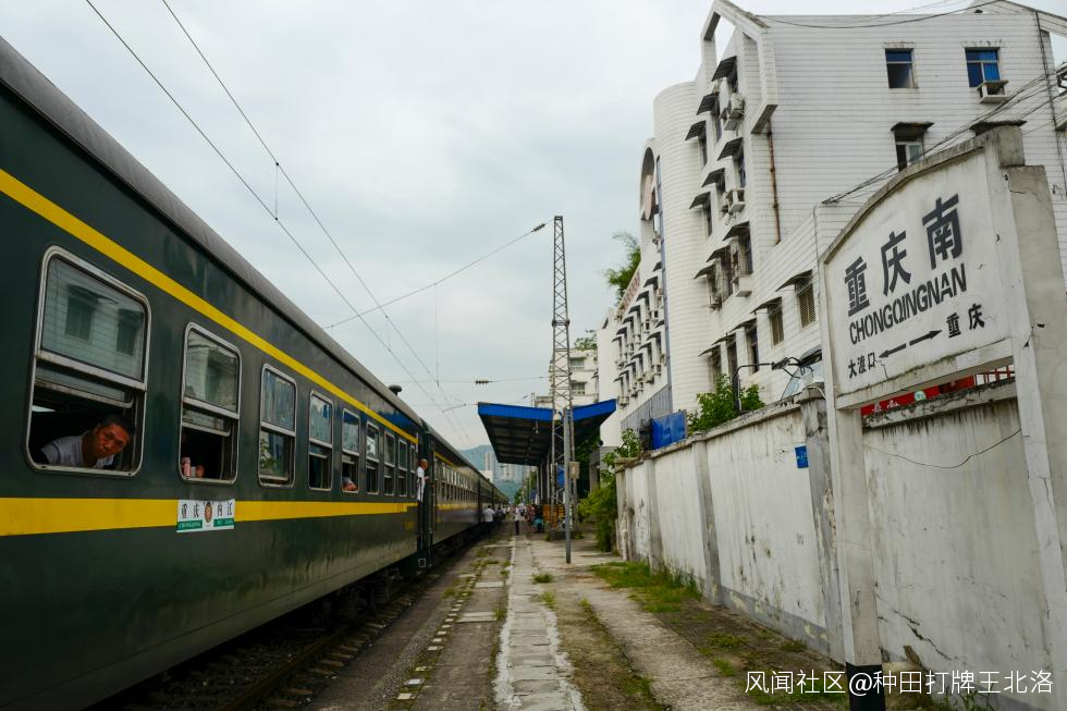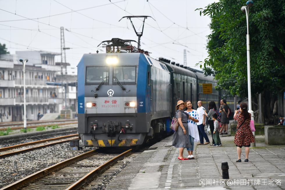 在成渝鐵路銅罐驛站,客運列車進站時,幾名來感受慢火車的遊客在站台上拍照留念(6月11日攝)。新華社記者 劉潺 攝