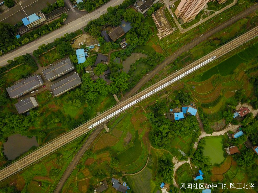 一列高鐵列車在成渝高速鐵路上快速通行(6月12日無人機拍攝)。新華社記者 劉潺 攝