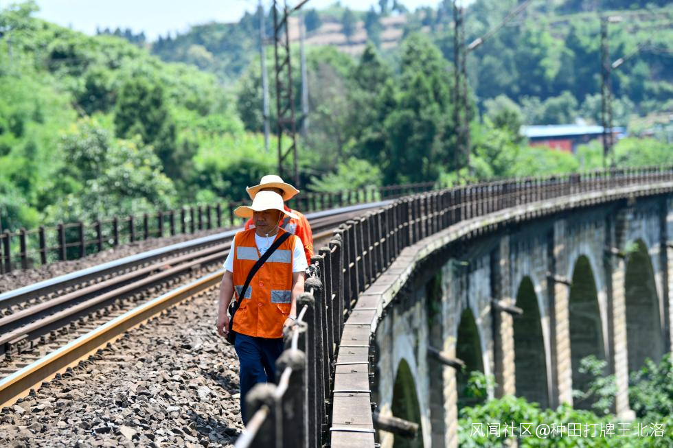 在成渝鐵路王二溪大橋,中國鐵路成都局集團有限公司內江工務段的值班人員在巡線(6月13日攝)。新華社記者 劉潺 攝