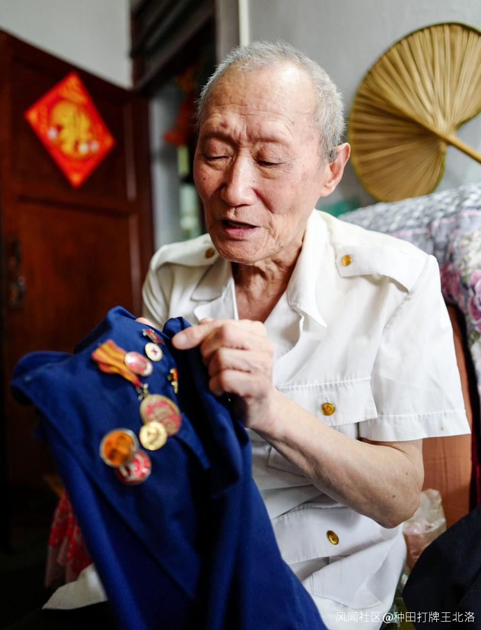 成渝鐵路的建設者曾德華老人展示成渝鐵路通車紀念徽章,介紹當年修路的情況(6月13日攝)。新華社記者 薛玉斌 攝