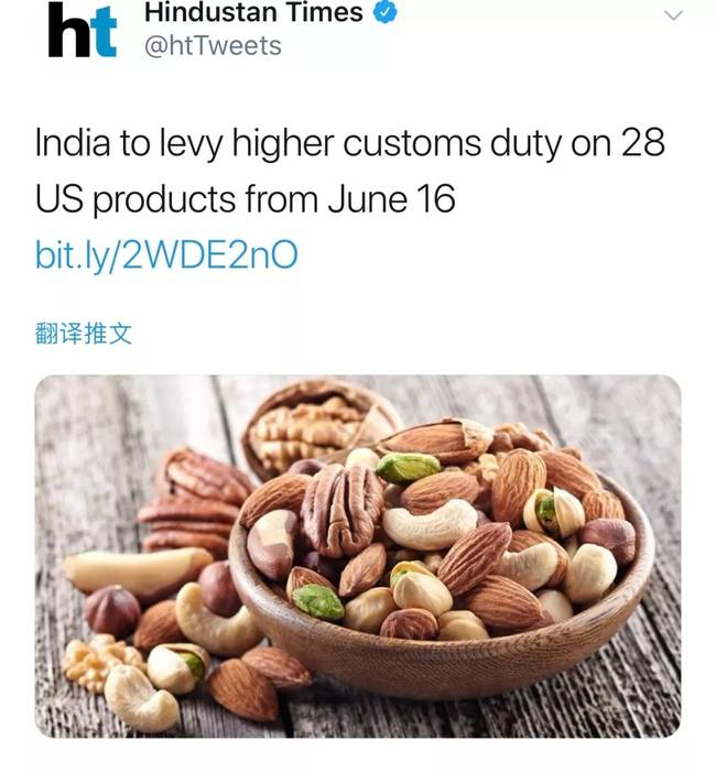 印度媒體援引印度政府消息人士的話説,作為回擊,印度將從今天開始對美加徵關税的商品包括杏仁、核桃和豆類等二十餘種。