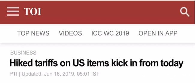 印度多家媒體報道,印度將從今天(16日)起對二十餘種美國商品徵收報復性關税,以回擊美國對印度加徵關税及取消印度普惠制待遇的有關舉措。