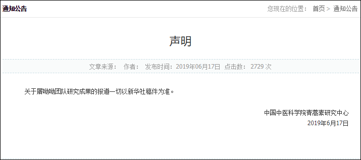 澎湃新聞:《中醫科學院中藥所:屠呦呦新研究系“進展”,非“重大突破”》