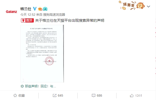 最近似乎流行企業官微公開“懟人”,6月17日,格蘭仕電器官微發佈《關於格蘭仕在天貓平台出現搜索異常的聲明》,表示其自拜訪拼多多以來,格蘭仕在天貓平台的搜索端陸續出現異常,造成了難以估計的實質性影響。