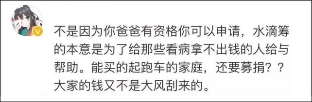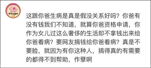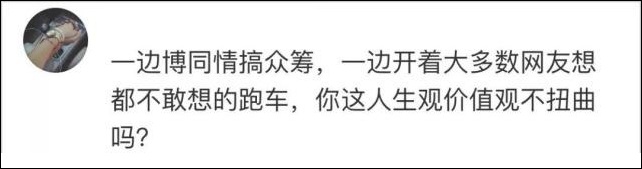 而在日前,微博網友@水瓶加油為明天 同樣在眾籌平台講述稱,自己的父親罹患胃癌,希望募款20萬進行治病。但是很快大家就發現,她早前發佈過多則微博炫耀自己買車買包,引起強烈的質疑之聲。