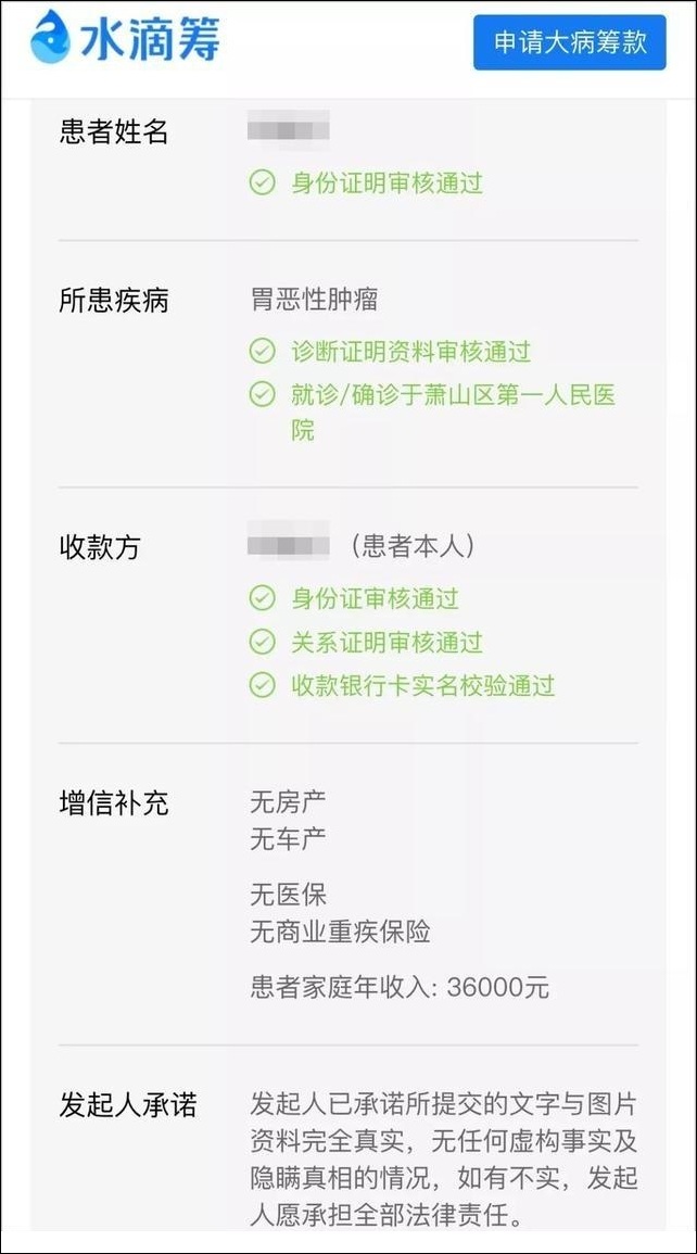 同時,蕭山的這位姑娘還補充了信息稱,自己無房產、無車產、無醫保、無商業重疾保險,家庭年收入也不過3萬6千。如其他眾籌發起人一樣,該當事人也承諾自己所提交的文字與圖片資料完全真實,沒有任何虛構事實和隱瞞真相的情況;如有不實,願意承擔全部法律責任。