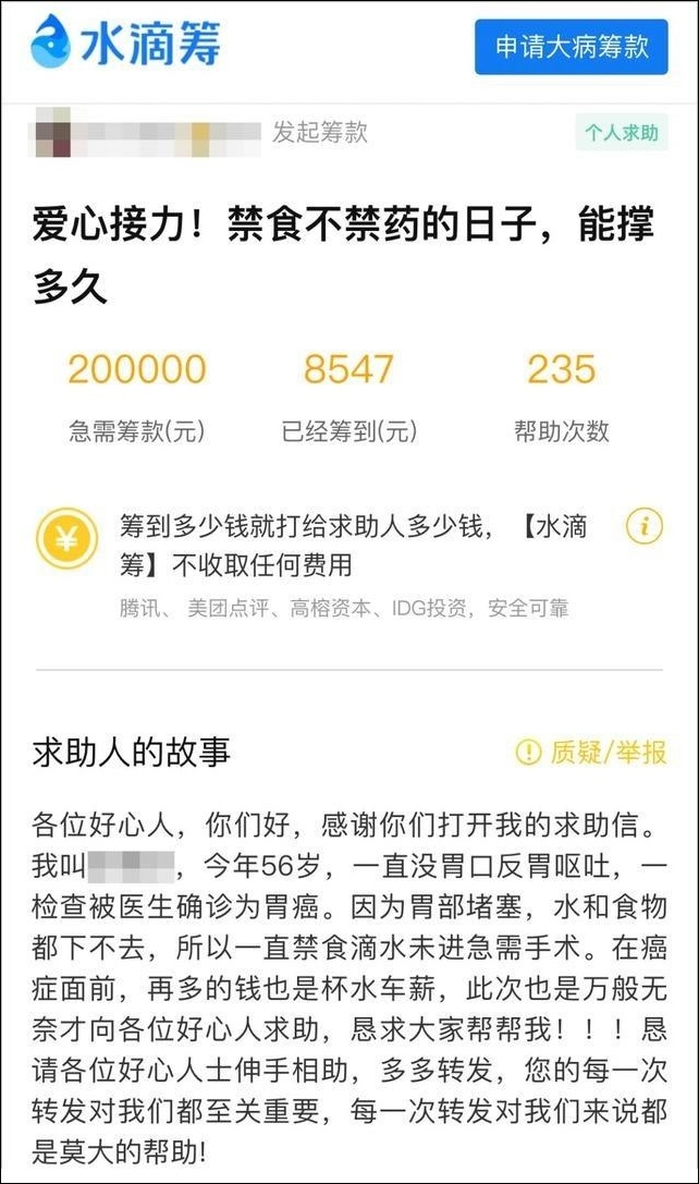 據媒體報道,這位微博網友是來自杭州蕭山的一位姑娘,大概在一個月前,她在某眾籌平台上發佈求助信,稱自己的父親現年56歲,剛剛被確診為胃癌。因為胃部堵塞,“水和食物都下不去”,急需手術,所以發起募款。她強調是到了萬般無奈的境地才進行募款,而設定的募款額度是20萬。