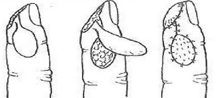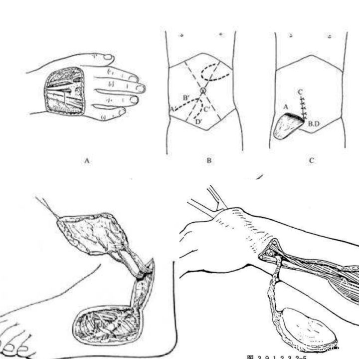 帶蒂皮瓣,需要間接轉移,先寄養在小腿或肚皮等部位上,建立新的血運後,再將蒂部切斷,完成最後轉移