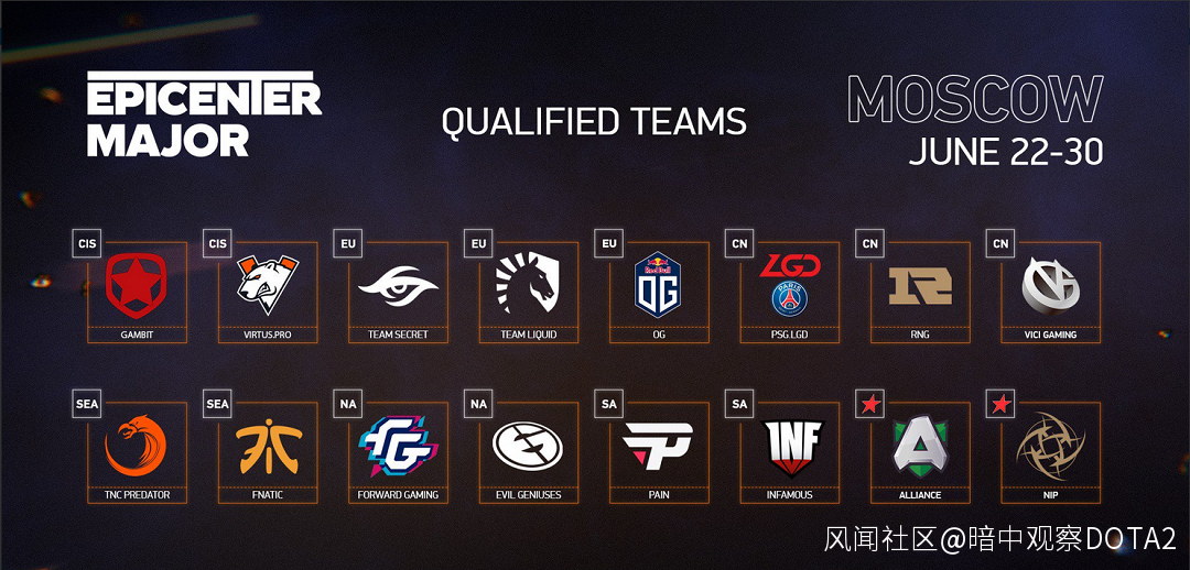 震中杯Major將於6月22日至30日在莫斯科進行,十六支戰隊將為高達100萬美元的總獎金和DPC積分展開激戰。目前,已有八支戰隊鎖定了TI9直邀資格,而本次Major的結果也將決定剩下四個直邀資格的歸屬。