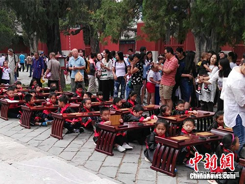 2016年9月1日,有小學在北京孔廟舉行入學“開筆禮”儀式,小學生穿着漢服,周圍還有家長。中新網記者 宋宇晟 攝