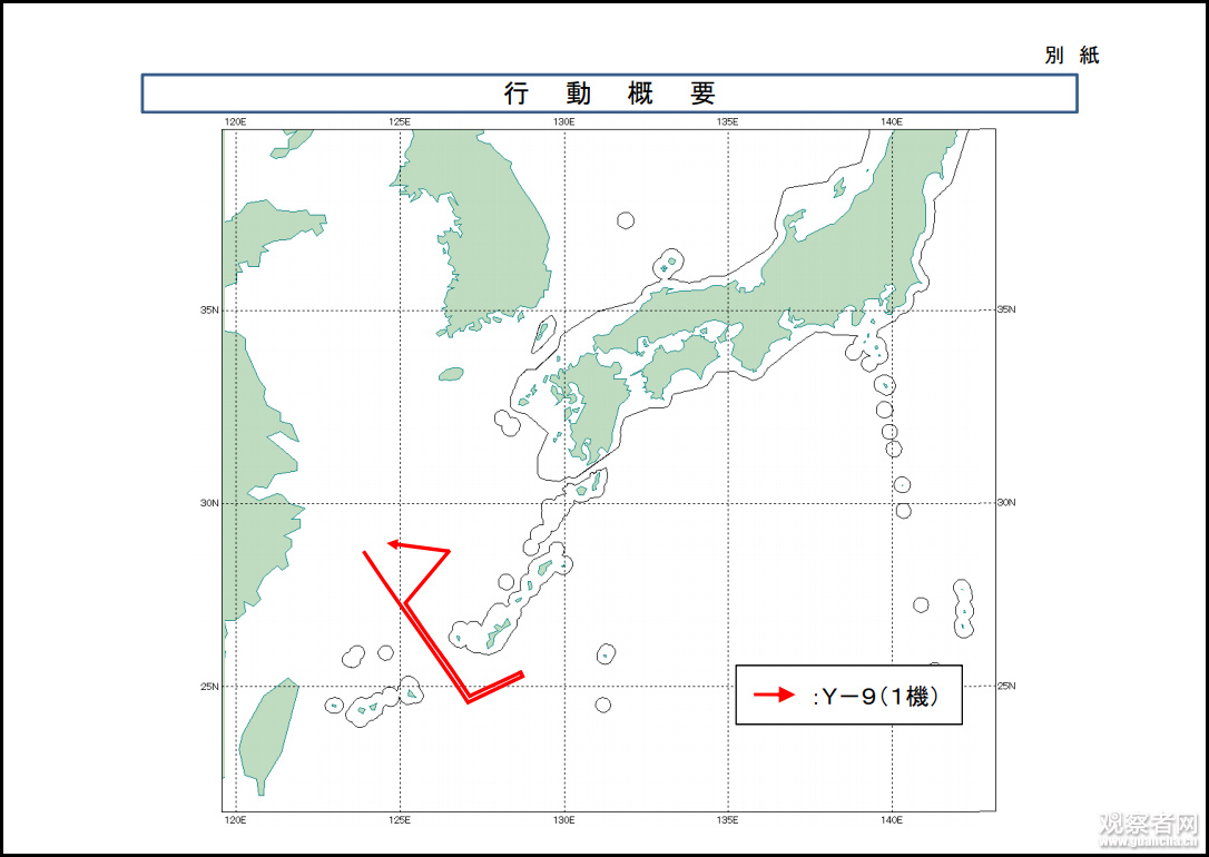 統合幕僚監部在其發佈的資料中還公開了這架運-9情報收集機的飛行路線,根據統合幕僚監部發布的路線圖,這架運-9情報收集機(日方説法,應為高新8號)是經沖繩本島和宮古島之前的宮古海峽空域南下,從東海空域突破島鏈進入西太平洋空域。