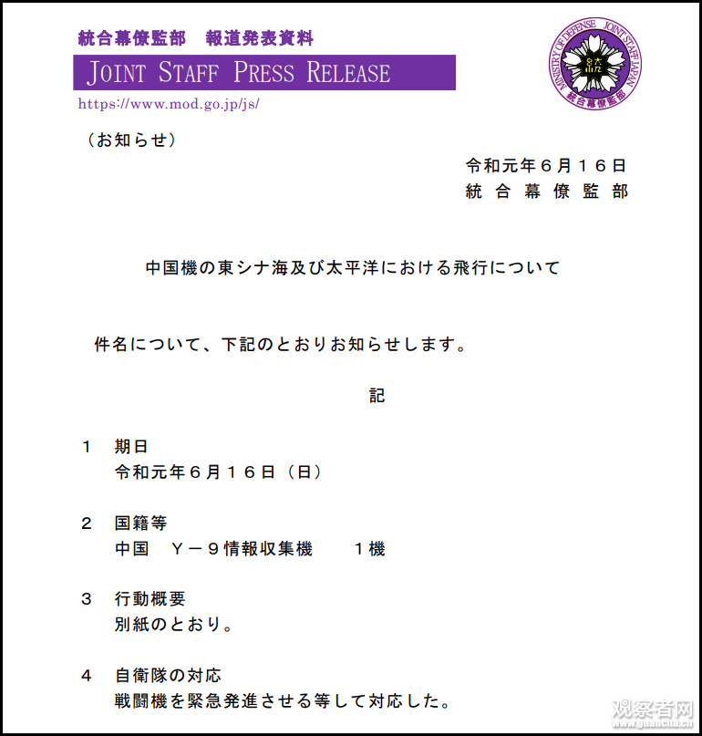 據日本防衞省統合幕僚監部最新發布的消息,6月16日,解放軍一架運-9情報收集機穿越宮古海峽前出西太平洋,日本航空自衞隊緊急出動戰鬥機進行應對。