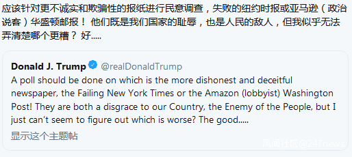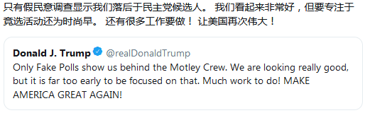 失敗的紐約時報或亞馬遜(政治説客)華盛頓郵報! 他們既是我們國家的恥辱,也是人民的敵人。來源特朗普推特。另一種聲音表示,距離總統大選還有很長時間,鹿死誰手,現在下結論還為時尚早。而這種對某個黨派有利的消息,往往會被那個黨派拿出來放大,打壓對手。正如特朗普所説,“為時尚早,還有很多工作要做”。不到最後一刻,變數會發生。不久前特朗普還放出話來,要是有人提供競爭對手爆炸性消息給他,他會聽取。有分析指出,他希望在2020年有幸運再次碰上“希拉里”事件,於是他已經在向某些組織傳遞信號了。(16年美國總統選舉時,希拉里因“郵件門”而輸給特朗普。)