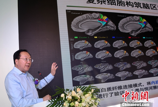 圖為中科院自動化所腦網絡組研究中心主任、中科搏鋭首席科學家蔣田仔研究員在研討會上介紹腦網絡組圖譜研究發展及相關應用情況。中新社記者 孫自法 攝
