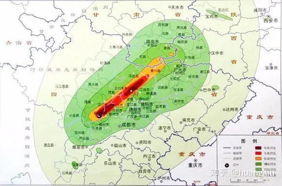 我們再來看汶川地震的神奇現象,汶川地震的烈度分佈,我一直看起來覺得很奇怪