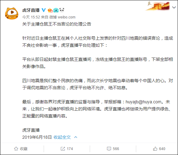 針對近日主播倉鼠王在其個人社交賬號上發表的針對四川地震的錯誤言論,造成不良社會影響一事,虎牙直播平台處理如下: