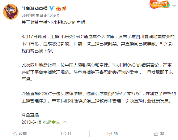 對於小米粥發佈與四川宜賓地震有關的不當言論一事,鬥魚直播表示,小米粥OvO已被封禁、其直播間已被屏蔽、相關影視內容已被下架。
