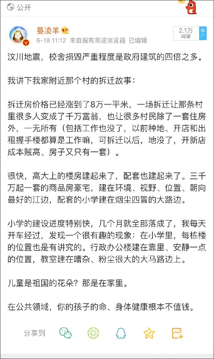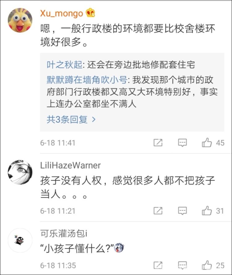剛剛在微博首頁看到@侯虹斌 轉發了這麼一條微博。作者説,他們附近村拆遷,小學建在煙塵四冒的大路邊,不僅如此,小學裏行政辦公樓建在靠裏、安靜的位置,教室建在嘈雜、粉塵很大的大馬路邊上。