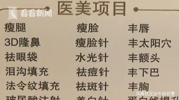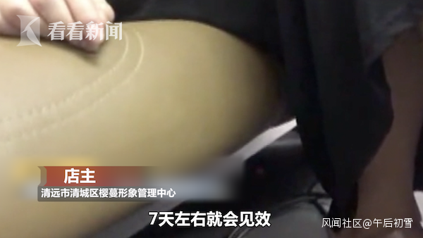 根據劉女士提供的線索,記者來到了清遠“櫻蔓形象管理中心”。在這家店的顯眼位置貼有美容美體養生、點痣紋繡、脱毛等廣告,而在通往二樓的樓梯旁瘦臉針、水光針、溶脂針、雙眼皮等項目的廣告清晰可見。面對記者的質疑,店主表示,在店裏打針的話性價比會相對比較高。如果覺得不安全,她也可以帶顧客到正規醫院做這些醫美項目。