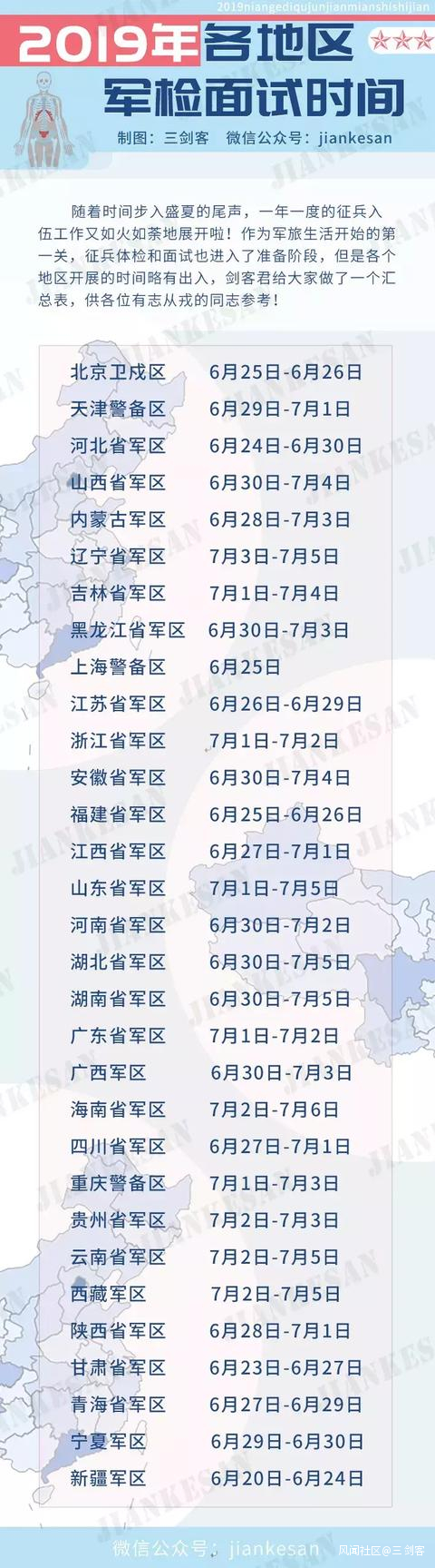 另外,報考軍校還有一些特殊要求,要在規定時間內進行專門的體檢、政審和麪試。畢竟軍人從事的是保家衞國的特殊事業,政治合格、身體過硬也是基本必備條件。下面附一張各地軍檢面試時間圖表。以便查詢。