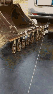 “第一個嘗試的是用挖掘機開啤酒瓶,那時候只用了一個啤酒瓶,沒想到一遍就成了,也沒想到一下子就火了。”