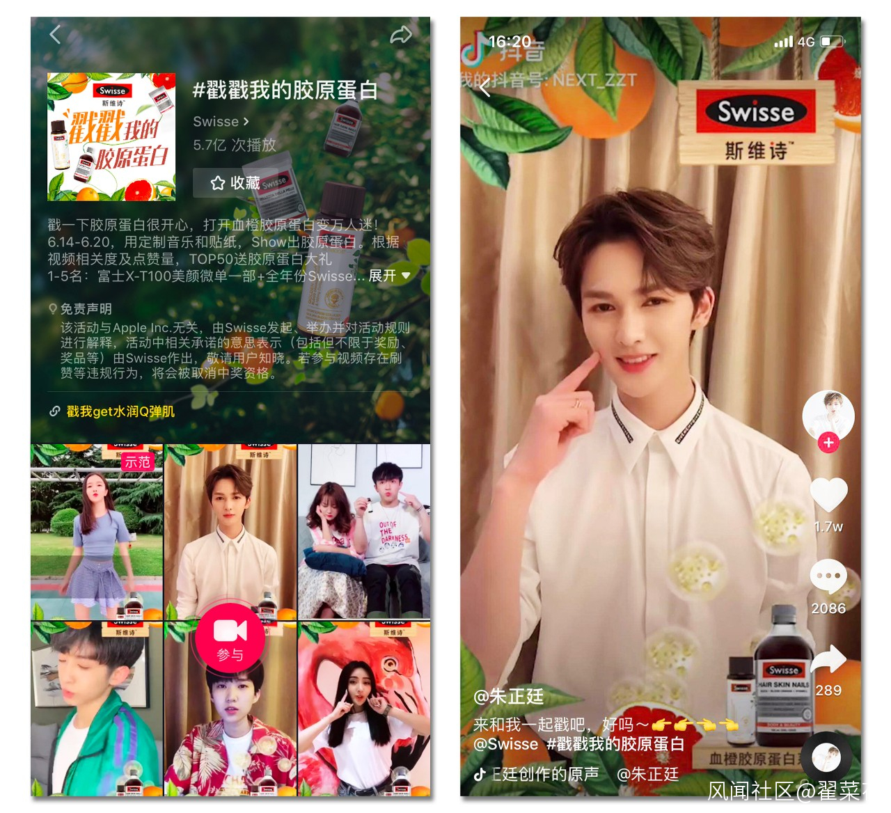 在選擇了“戳臉”作為連接點之後,Swisse一方面借勢年輕偶像朱正廷,帶動粉絲互動;另一方面通過行業大V、網紅等頭部KOL展示膠原蛋白品類。以KOL的PGC內容去引導UGC自我發力,再導流至電商渠道,多維度進一步帶動用户體驗品牌理念,構建更豐富的內容生態。