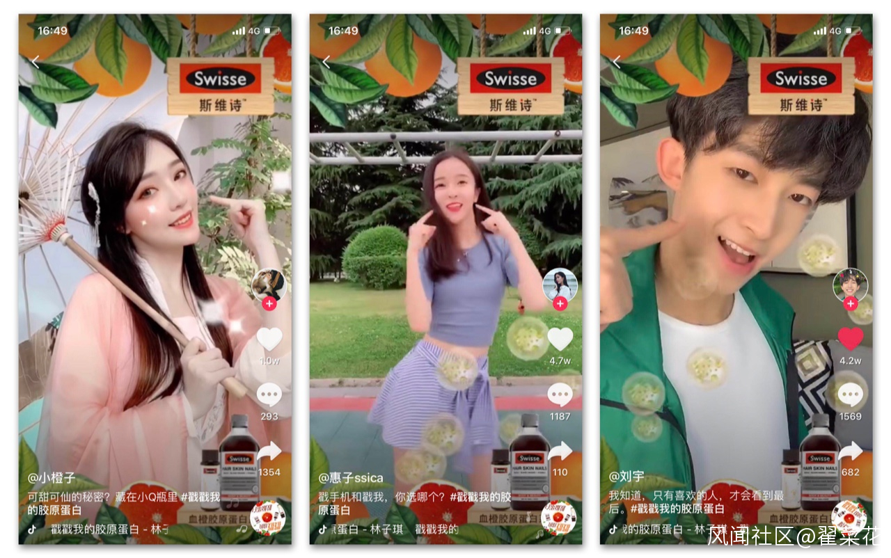 Swisse通過洞察出的行為特徵,以聚集時下最龐大年輕羣體的病毒傳播渠道為“戰場前線”,直觀展現了一個表述生動的核心利益點:戳臉既能變美,建立了品牌聯想,而這種聯想使得用户將Swisse與膠原蛋白產品畫上了“=”。