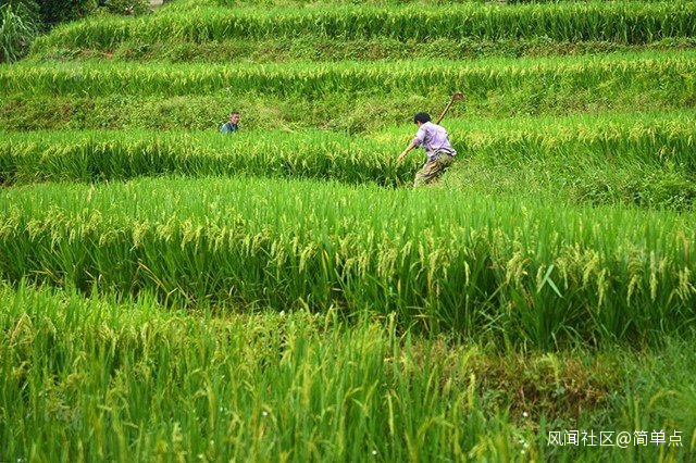 母女倆一直佝着腰,頭背頂戴烈日,一點點地縮小缺口。王海蝶説,插秧不累,只是熱,上面曬,下面又蒸。割稻是更重的活,手上要用勁。最累的活是掰玉米,玉米葉邊緣帶着鋒利的鋸齒,割人刺癢,背玉米回家又是一路上坡,負擔越來越沉重。