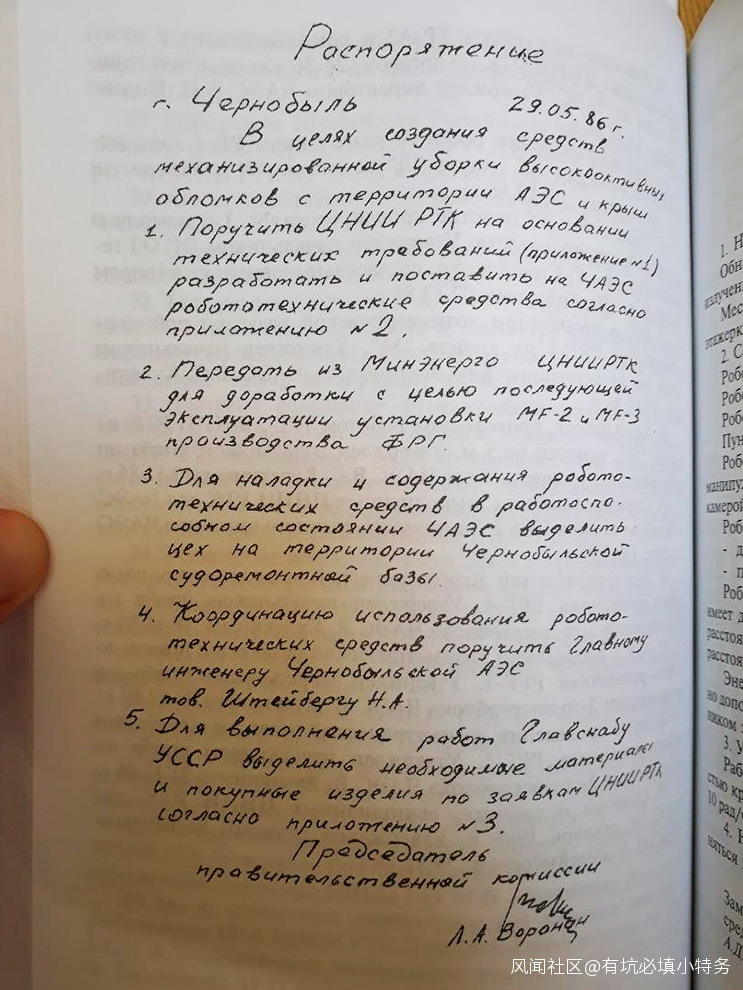 政府委員會主席利夫.沃羅寧(Льв Воронин)1986年5月29日簽發的手寫命令,使中央機器人技術和技術控制論科學研究所開始研製救災機器人。