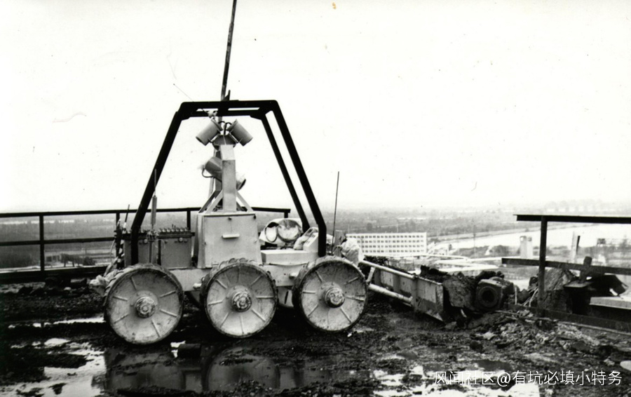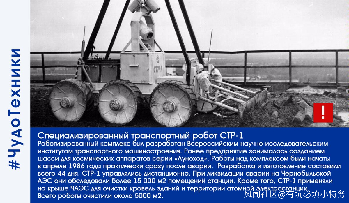 (這張是譯者我找到加上來的) СТР-1專用運輸機器人:全俄運輸機械製造科學研究所研製的機器人綜合系統。此前,全俄運輸機械製造科學研究所為“月球車”系列航天設備研製地盤。機器人的研製工作始於1986年4月,幾乎在事故發生後就馬上開始。研製和製造共花了44天。СТР-1通過遙控控制。在消除切爾諾貝利核電站事故影響時,它們調查了超過15000平方米的電站廠房。此外,СТР-1用於在核電站頂部清理建築部房頂以及清理核電站區域。清理總面積近5000平方米。