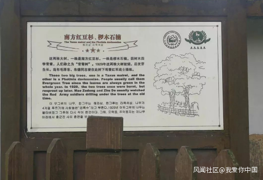 2019年6月13日,筆者來到井岡山,在瞻仰大井村毛澤東故居時和這身後兩棵樹合影。這兩棵樹一棵學名是南方紅豆杉,另一棵是欏木石楠。據導遊講,這兩棵樹非常有靈性。井岡山斗爭期間,毛澤東在白屋居住時,經常在兩棵樹下讀書納涼、指導戰士訓練。1929年2月,毛澤東率紅四軍轉戰贛南,敵人竄到大井村將白屋燒了個精光,兩棵樹也被燒焦。然而,這樹並沒有死。1949年毛澤東領導人民取得了天下,兩課樹此時神奇般的活了過來並長得枝繁葉茂,濃蔭蓋地。1965年5月,毛澤東重上井岡山,兩課樹第一次開出瞭如銀如雪的白花歡迎毛主席。1976年9月9日毛主席逝世,兩棵樹綠葉脱得精光、樹也枯萎了。後經搶救,才得以再生。