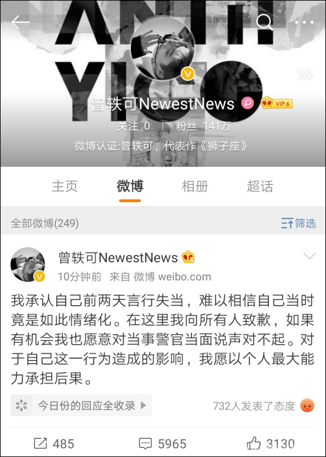 剛剛,歌手曾軼可就在邊檢入境時不配合檢查、在網上披露民警個人信息及照片一事發文道歉,稱“我承認自己前兩天言行失當,難以相信自己當時竟是如此情緒化。在這裏我向所有人致歉,如果有機會我也願意對當事警官當面説聲對不起。對於自己這一行為造成的影響,我願以個人最大能力承擔後果”。