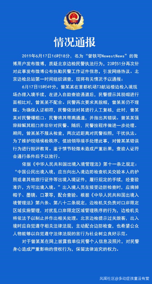 6月19日早晨,北京邊檢官博發佈通報,稱6月17日下午,曾軼可在邊檢入境現場辦理入境手續時,在進入自助查驗通道後,民警提示其脱帽進行面相對比但她並不配合,民警依法對其進行人工複核卻遭其爆粗口,遂將其帶離通道並指出錯誤。但她仍不服從檢查並兩次近距離對民警拍照,干擾執法,值班領導對其批評教育後予以放行。北京邊檢表示,對於曾軼可在網上披露民警個人信息及照片,對民警身心造成嚴重影響的侵權行為,保留法律追究的權力。