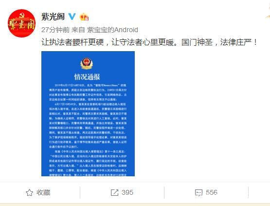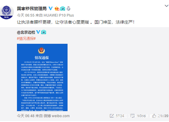 隨後,國家移民管理局轉發北京邊檢對曾軼可機場衝突事件的情況通報,並配文稱:“讓執法者腰桿更硬,讓守法者心裏更暖 。國門神聖,法律莊嚴!”紫光閣、共青團中央等官博同樣轉發了這一回應。而曾軼可早前指責邊檢人員“蠻不講理,私用職權”以及曬出邊檢人員證件照的兩則微博,目前都已刪除。