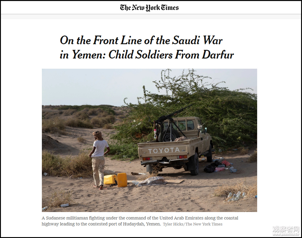 去年12月,《紐約時報》報道稱,沙特在也門內戰中大量使用了來自蘇丹的僱傭兵,而其中很多蘇丹人都是14歲左右的孩子。返回蘇丹的僱傭兵告訴《紐約時報》,自2016年年底以來,沙特領導的聯軍在也門僱傭了多達1.4萬名蘇丹士兵,其中不少人甚至是14歲的孩子。由於每名新兵最高可獲得1萬美元的報酬,因此這份要命的工作對於處於經濟制裁之中的蘇丹年輕人來説很有吸引力。