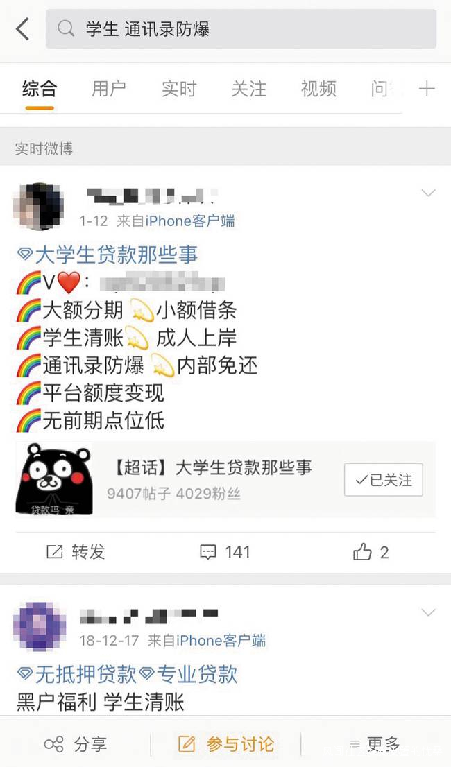 在新浪微博等社交平台上,活躍着一些提供通訊錄防爆服務的賬號。按照多位提供該項服務的人介紹,從714平台借錢不會上徵信,這些平台本身也會因高利率等各種問題,簡單採用向用户通訊錄聯繫人曝光、間接催收的方式。一些人從714平台借錢還分期平台的賬單,心理上認同躲過了通訊錄被爆,就上岸了。