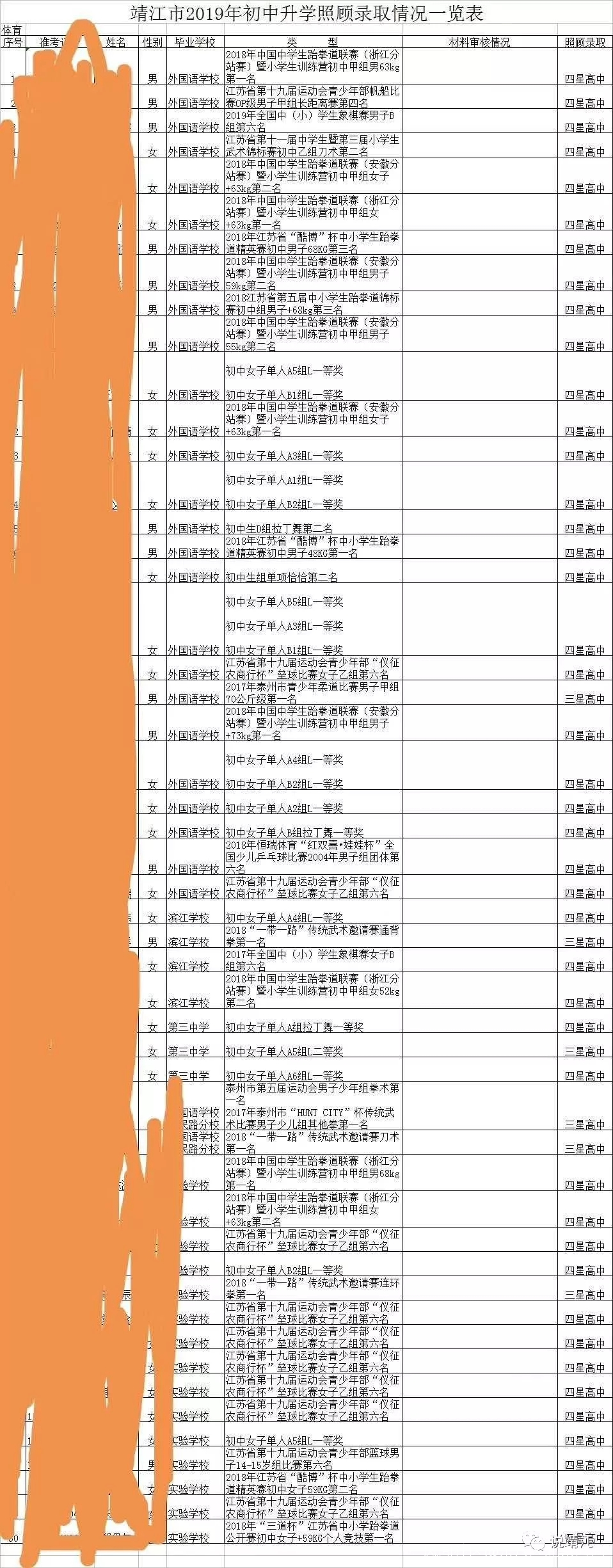 澎湃新聞記者看到,在上述50個照顧生名單中,來自靖江外國語學校、濱江學校、實驗中學等五所學校的50名學生,分別在跆拳道、帆船、傳統武術、壘球等省級、國家級比賽項目中獲得名次,將被靖江三星級、四星級高中照顧錄取。