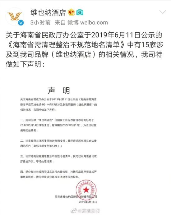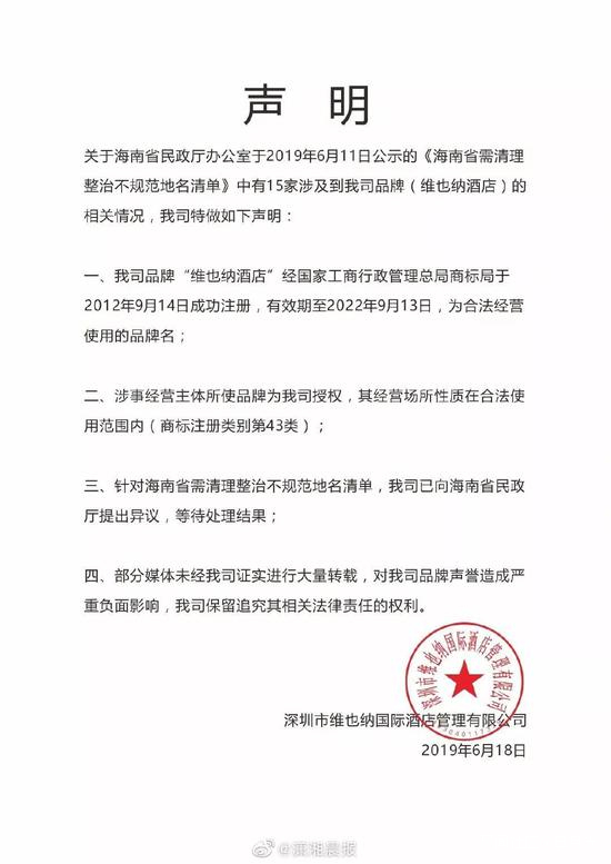 針對海南省民政廳發佈的清單,15個名稱涉及維也納酒店,深圳市維也納國際酒店管理有限公司18日發佈聲明: