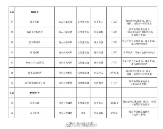 其中,中央海景大道商業街、釣魚台別墅、太平洋別墅等因刻意誇大被列入清單;維多利亞花園、奧林匹克花園、塞維拉小區因崇洋媚外被列入清單;帝王花園小區、皇家騎士酒店等因怪異難懂、帶有封建色彩被列入清單。
